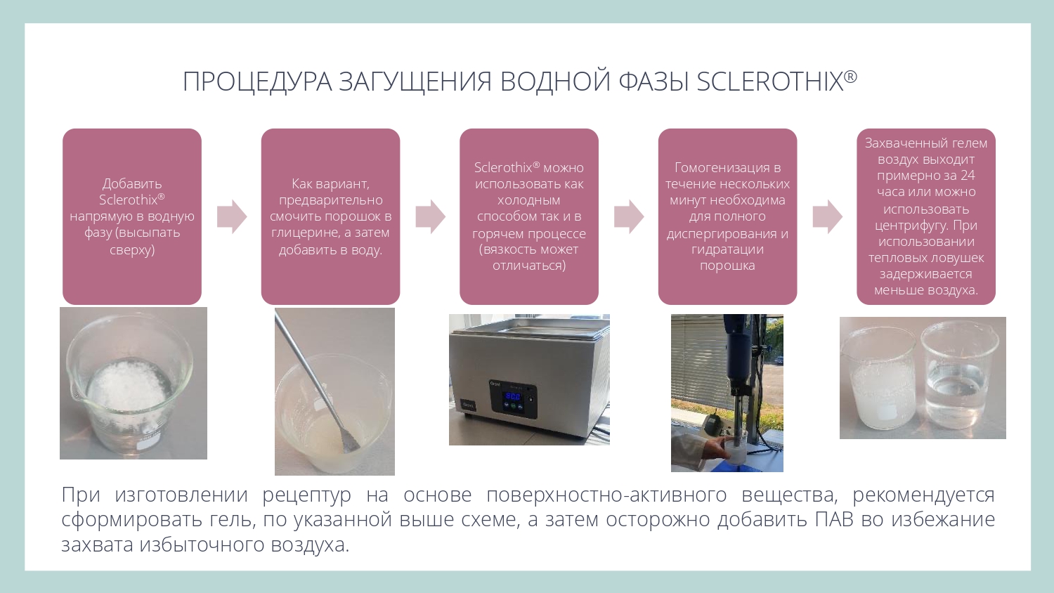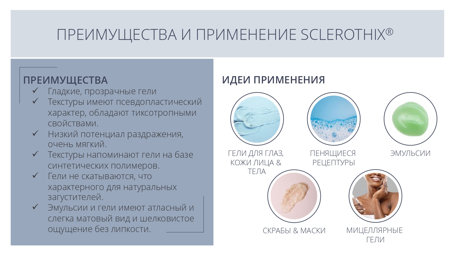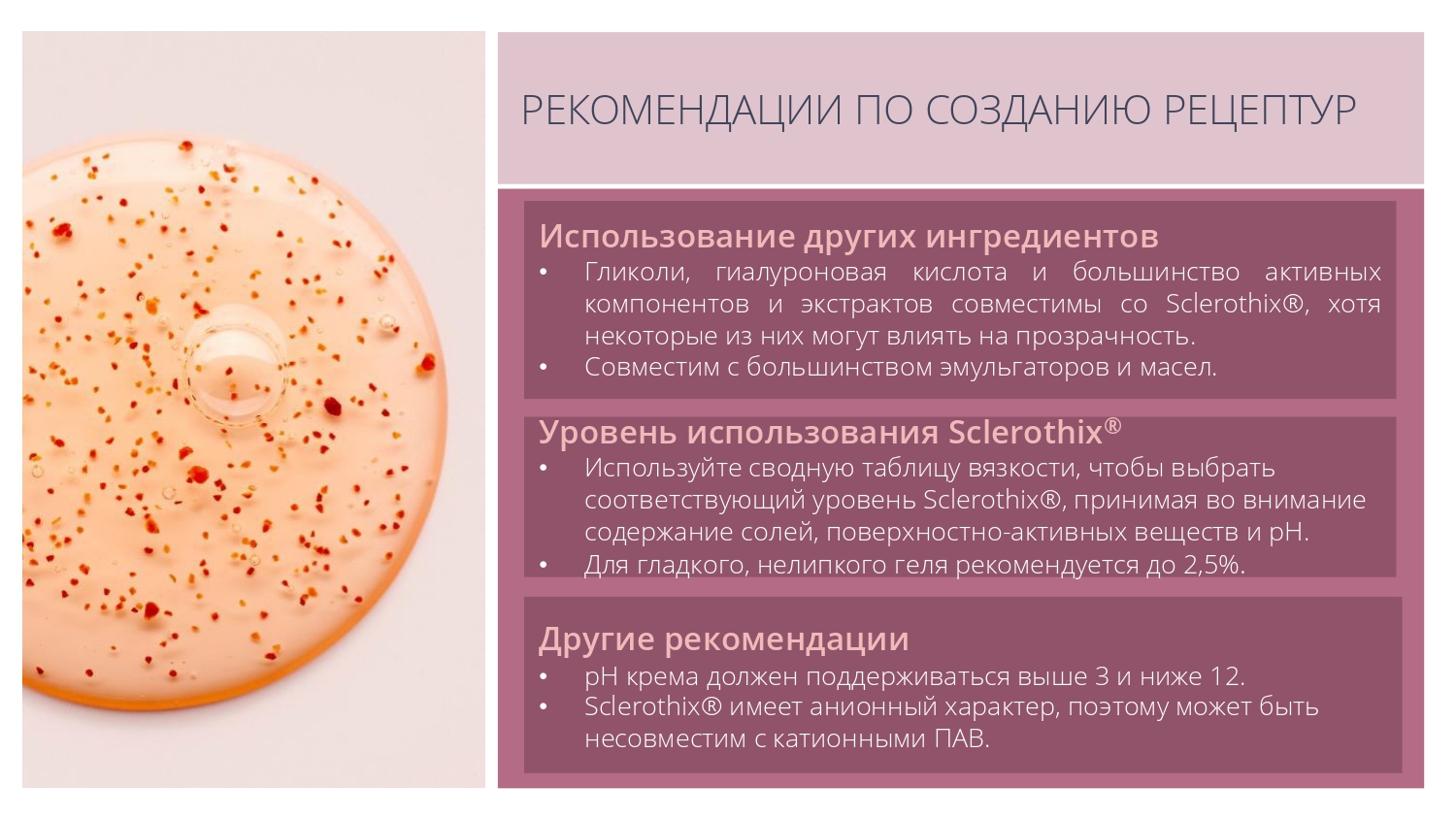 Sclerothix является эффективной добавкой для улучшения суспендирования (подвешивания) различных частиц - скрабов, глин или пигментов, в том числе в составе моющих систем.